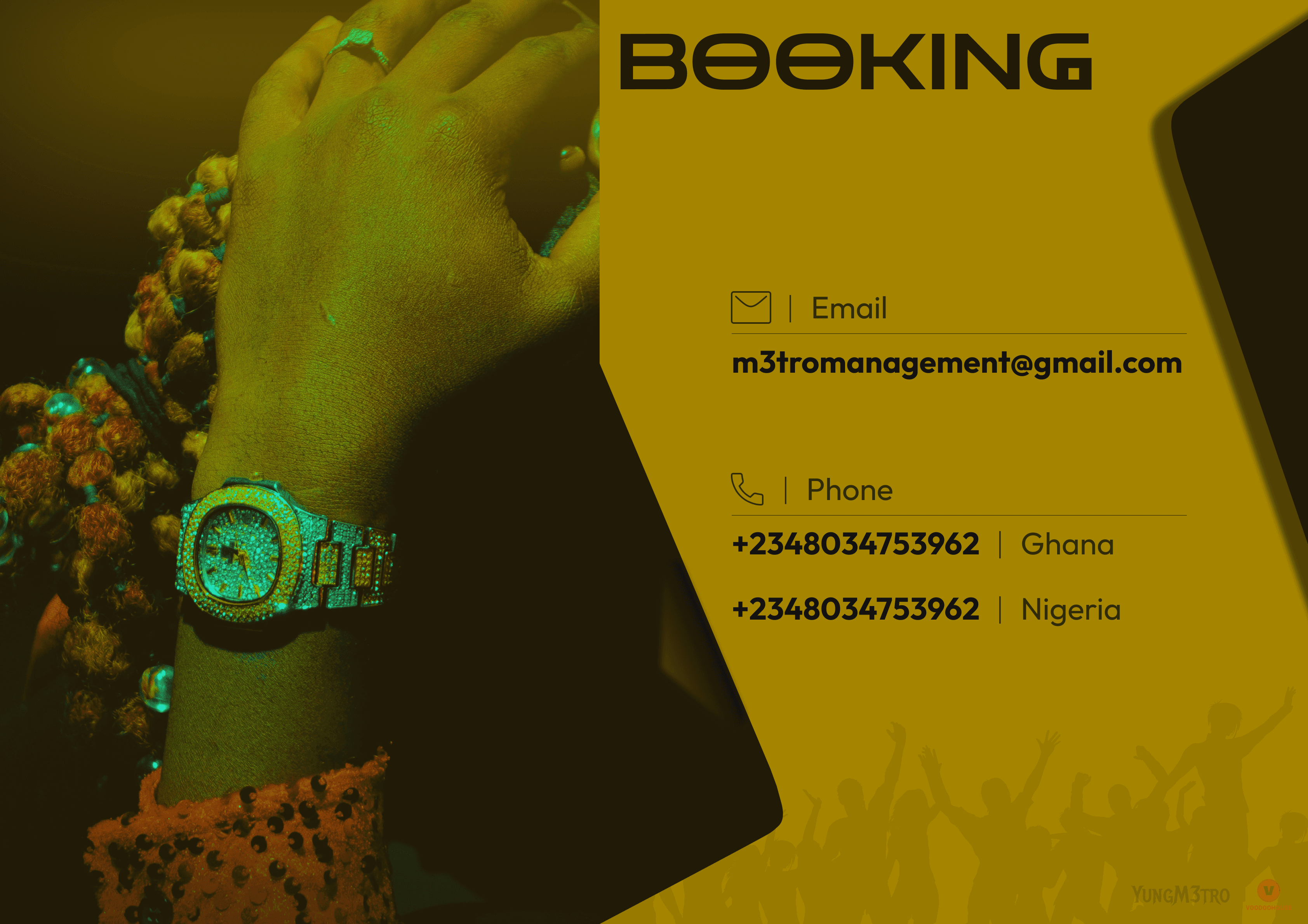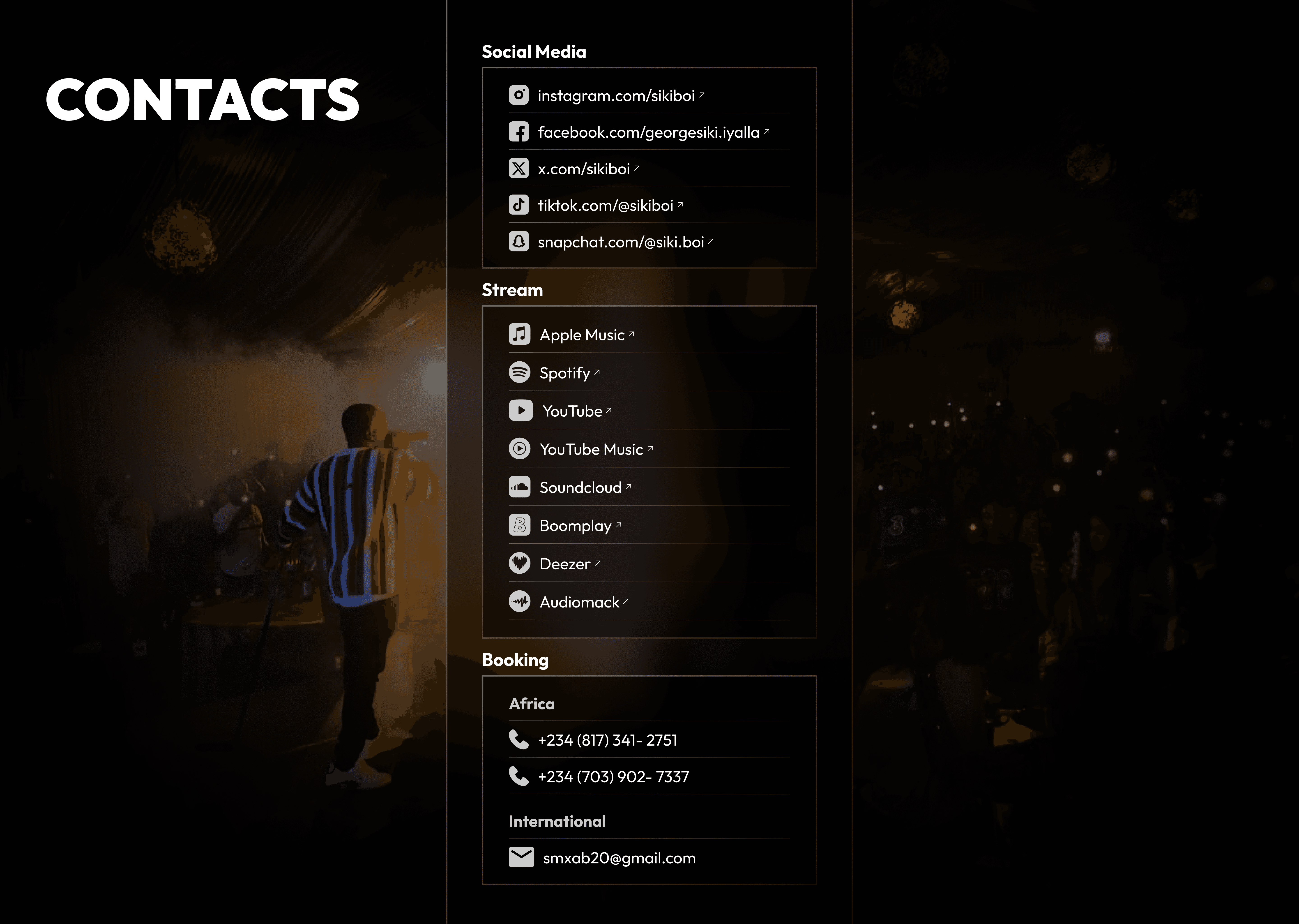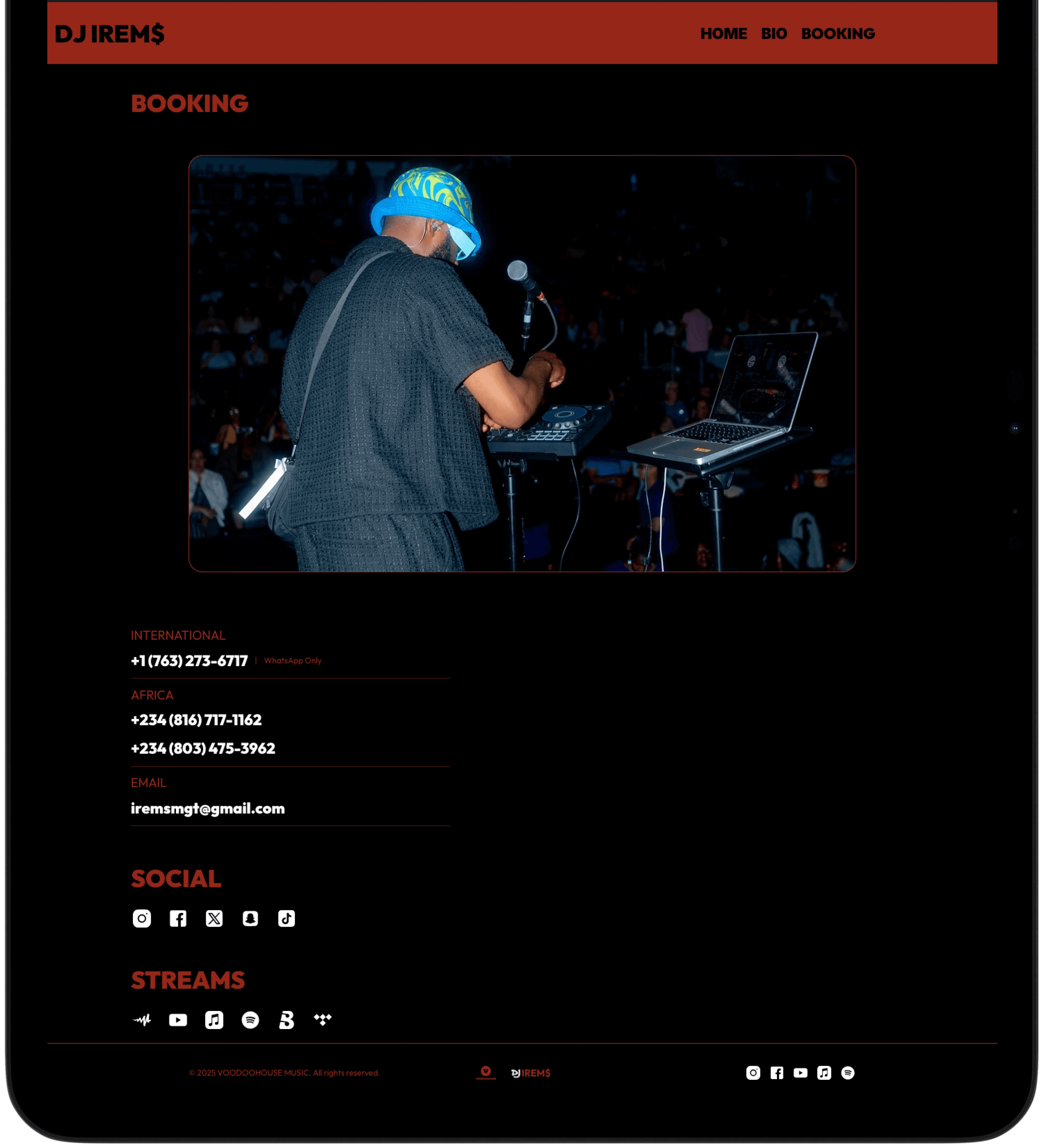 Booking page with contact, social media and streaming links