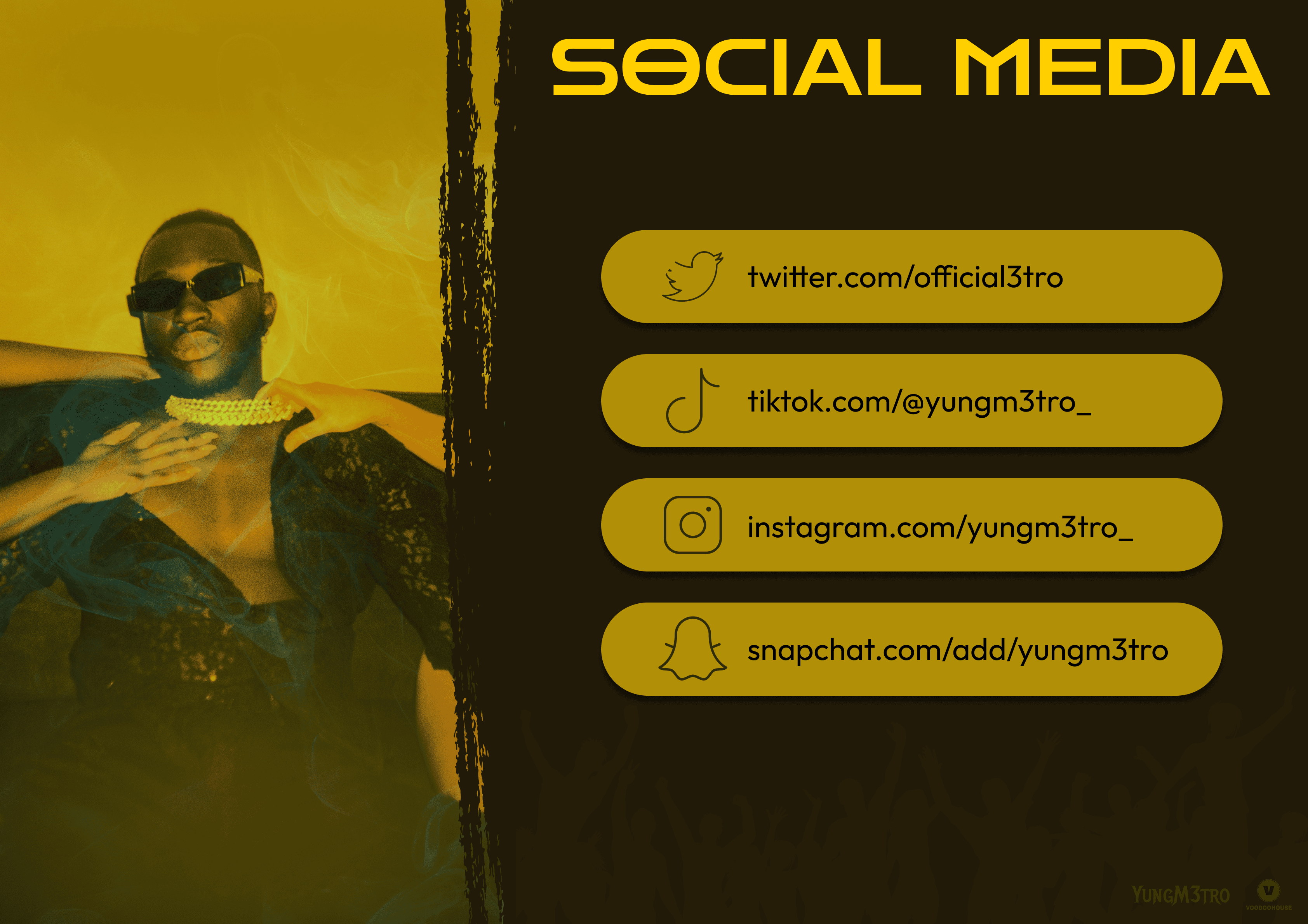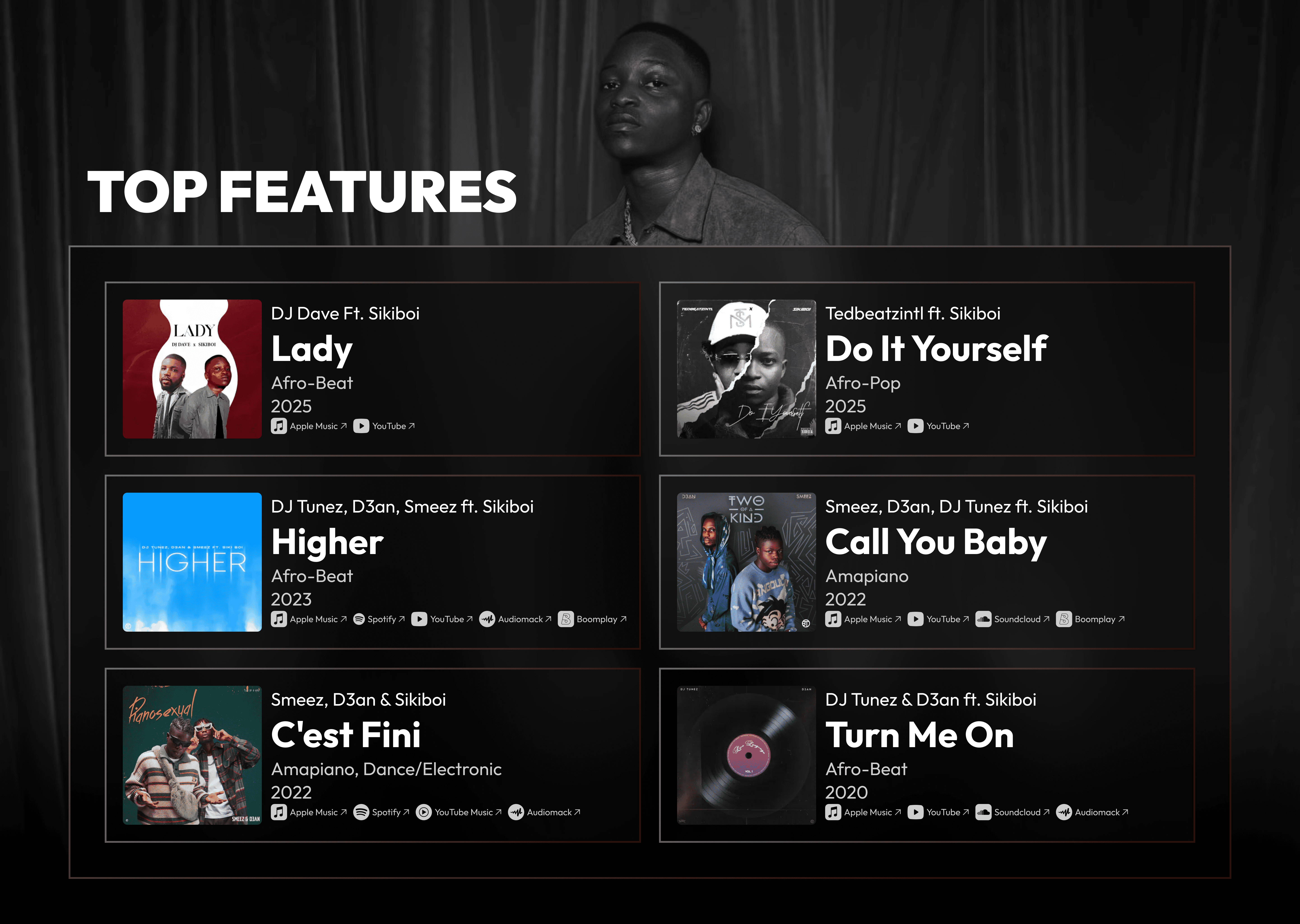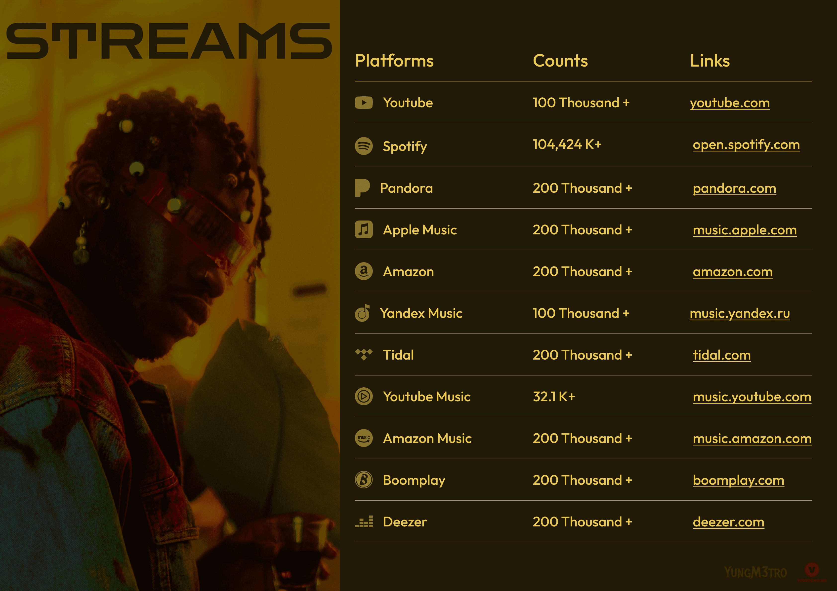 Booking page with contact, social media and streaming links