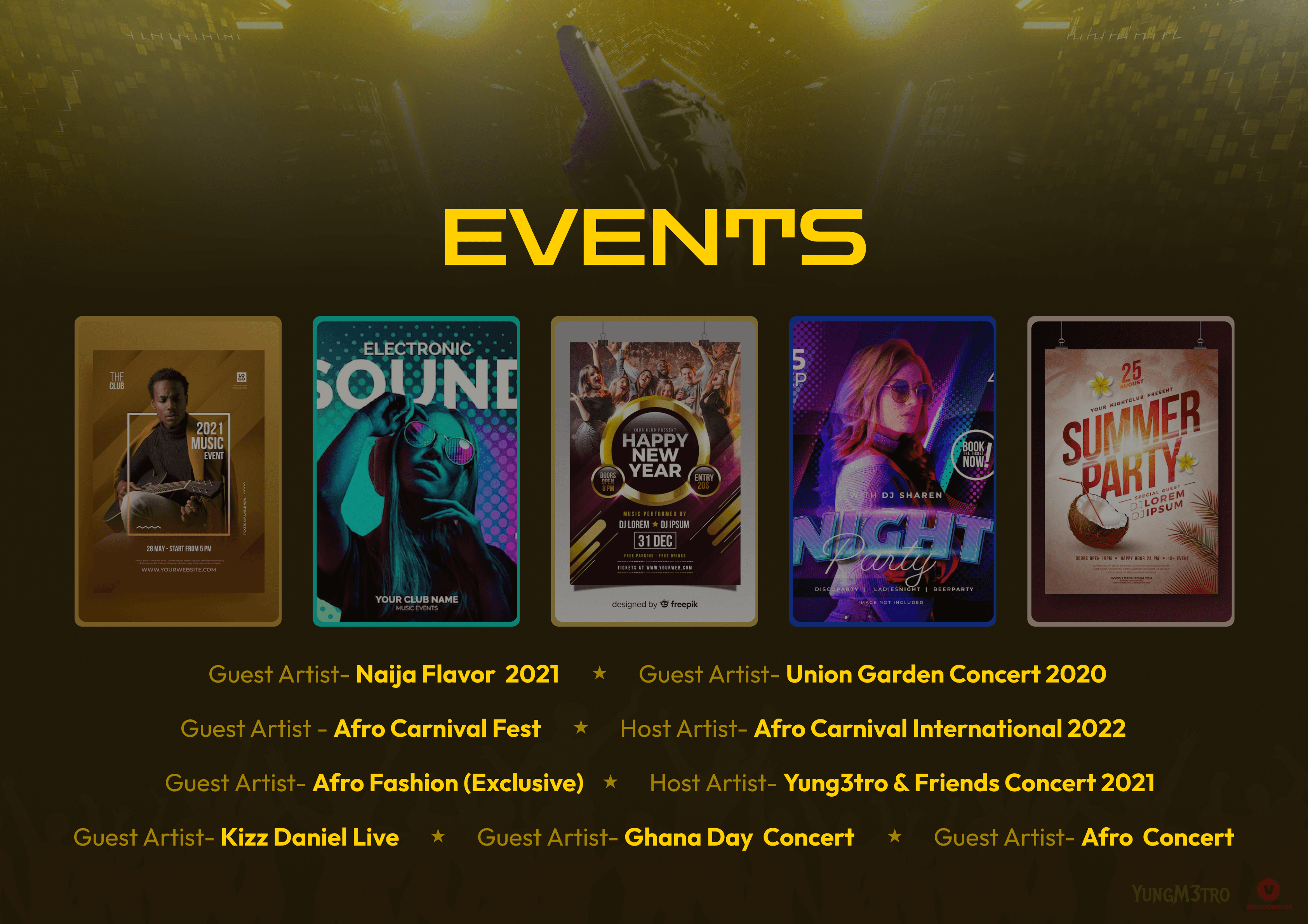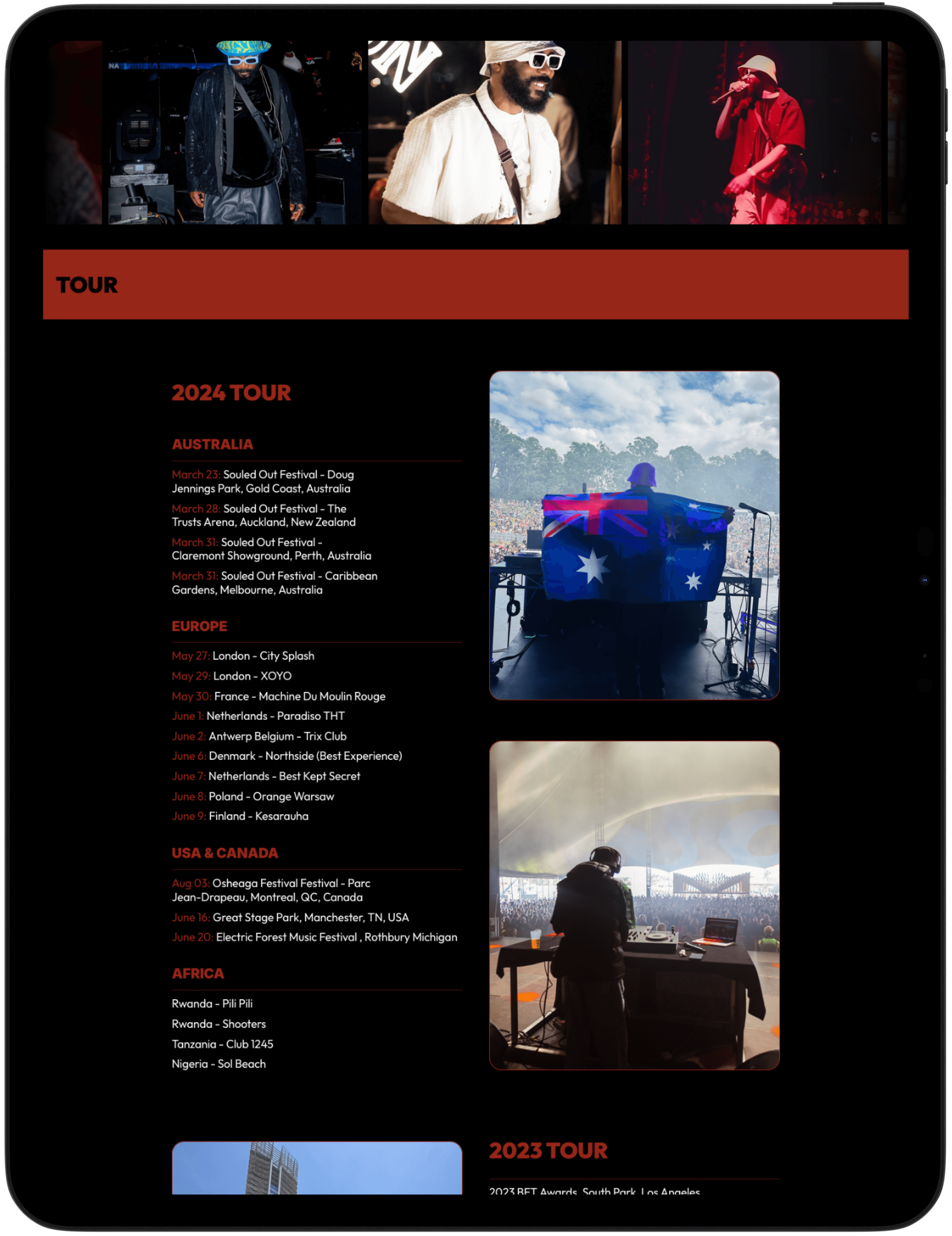 Tour page listing dates with locations, festival names